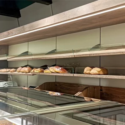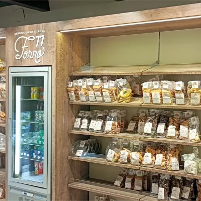 Nuovo arredo per lo storico panificio Forno 77 della famiglia Ciampo. In questo progetto abbiamo voluto valorizzare il centenario forno a pietra che la famiglia Ciampo utilizza con tanto amore e fatica. Arredi realizzati nella nostra falegnameria, piani in gress e vetri temperati incollati, vetrine refrigerate Frigomeccanica Next.